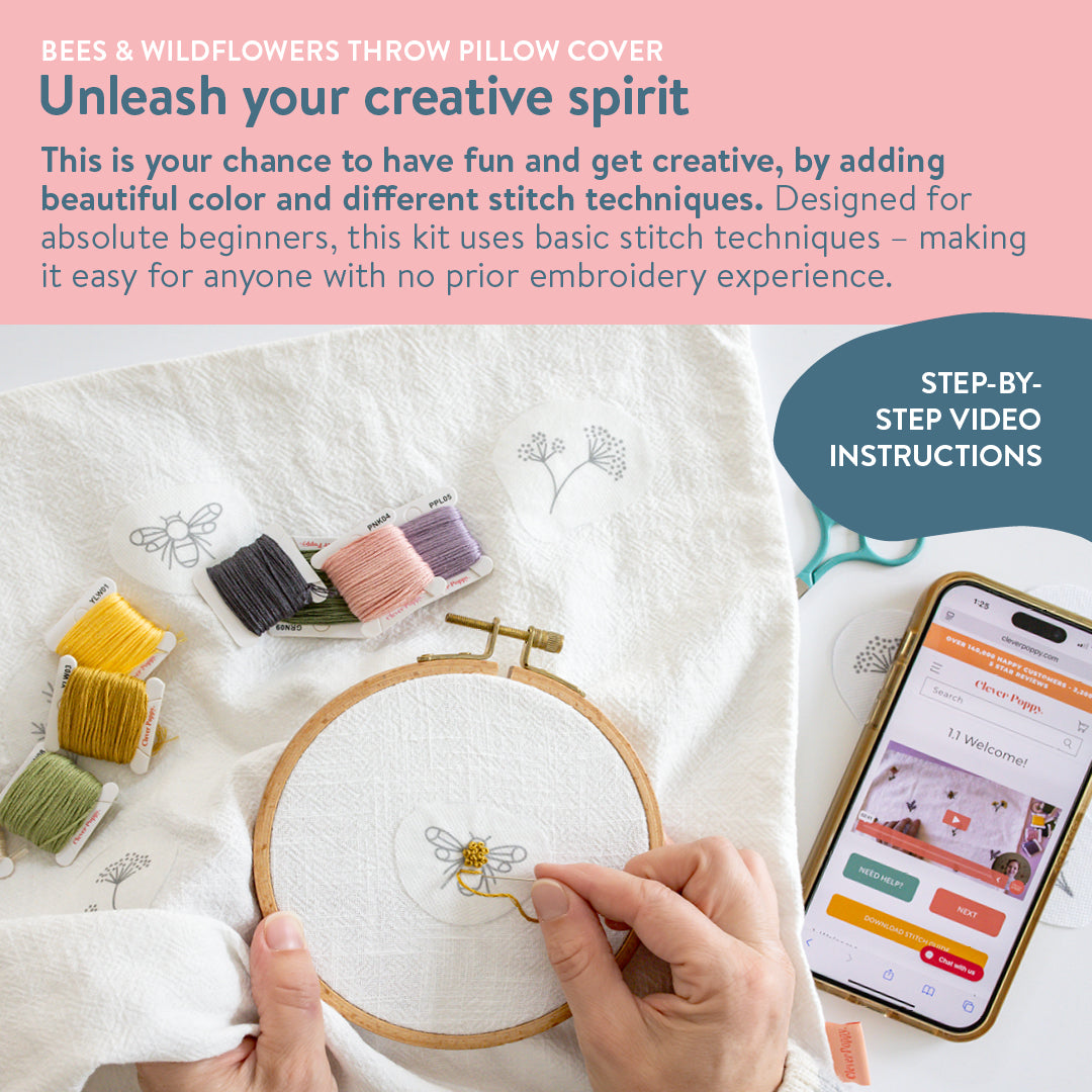 This beginner-friendly kit guides you through stitching our ever-popular Bee Happy design - complete with buzzing bees and pretty florals - onto a premium cotton-linen blend throw pillow cover, using our clever wash away embroidery stickers.